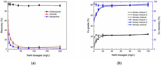 Based on the single mineral flotation results, synthetic mixtures flotation tests were carried out to validate the selective depression effect of NaAl at pH 9. The results obtained are shown in Figure 5b. For the binary mixture 1, the Cu grade gained a significant improvement after the addition of NaAl. For the binary mixture 2, the addition of NaAl improved Cu recovery. The binary mixture flotation results confirmed that NaAl had an excellent selectivity of depression. In the ternary mixture system, significant improvements in both Cu recovery and grade were observed. Without adding NaAl, the Cu grade was only 22%; whereas a concentrate with a Cu grade of 31% could be achieved when the dosages of NaAl increased to 40 mg/L. Similarly, as the dosages of NaAl increased to 40 mg/L from 0 mg/L, the Cu recovery increased to 91% from 62%. The ternary mixture flotation results indicated that NaAl simultaneously depressed chlorite and serpentine. According to Figure 5b, with a further increase on the dosage of NaAl (up to 120 mg/L), no further improvement on flotation was observed as the maximum Cu recovery and grade were already reached, indicating that that 40 mg/L would be sufficient for the flotation separation for binary and ternary mixtures.