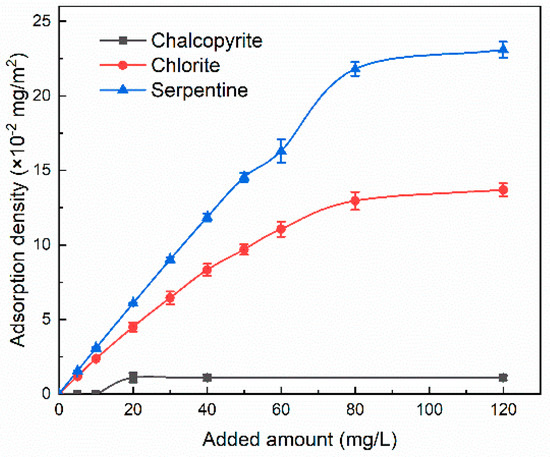 Figure 6 shows the adsorption of NaAl on chalcopyrite, chlorite, and serpentine surfaces. The adsorption density of chlorite and serpentine increased with an increase of NaAl dosages in the range of 5–80 mg/L. When the addition dosage exceeded 80 mg/L, the adsorption on the surface of gangue minerals reached saturation with the adsorption density of 0.14 mg/m2 for chlorite and 0.24 mg/m2 for serpentine. Compared to the two gangue minerals, the adsorption density on the surface of chalcopyrite was negligible (less than 0.02 mg/m2). The results for the adsorption measurement indicated that NaAl selectively adsorbed on the surface of chlorite and serpentine and hence showed an inhibitory effect, which was in good agreement with the flotation results.