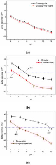 The zeta potentials of chalcopyrite, chlorite, and serpentine minerals in the absence and presence of NaAl were measured, and the results are shown in Figure 7.
