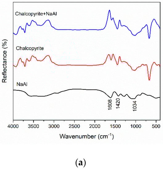 IR spectra of chalcopyrite with and without pre-treatment of NaAl are shown in Figure 8a. According to Figure 8a, it was clear that NaAl had a negligible effect on the spectrum of chalcopyrite. After conditioning with NaAl, there were no new characteristic adsorption bands observed, which implied that the adsorption ability of NaAl on chalcopyrite was fairly weak.
