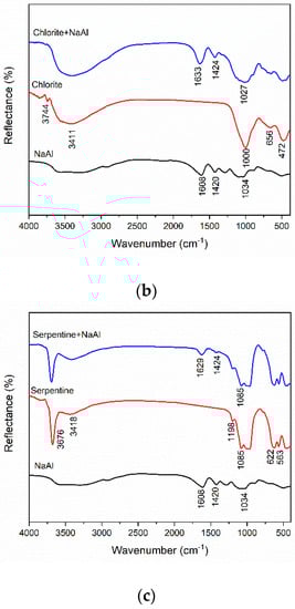 IR spectroscopy was performed to define the adsorption mechanism of NaAl on the surface of the three minerals. The IR spectra results can be seen in Figure 8.