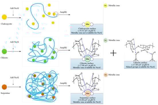 According to the flotation, adsorption measurement, zeta potential, and FTIR results, the possible depression mechanism of NaAl on chlorite and serpentine minerals could be summarized as seen in Figure 9.