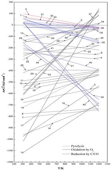 Under different roasting conditions, pyrite can be transformed to a variety of solid phases such as pyrrhotite (Fe1−xS, mainly Fe0.875S or FeS which is the commonest form [,]), magnetite (Fe3O4), hematite (Fe2O3), ferrous sulphate (FeSO4) and ferric sulphate (Fe2(SO4)3), and gas phases such as sulphur vapour (S2) and sulphur dioxide (SO2). In the presence of C or other phases such as CaO, MgO and Al2O3, various reduction reactions by C/CO or sulphur-fixation reactions can also take place. According to the relevant species of reactants and resultants, 45 possible chemical reactions can be deduced as listed in Table 1. They can be divided into mainly three categories: (i) pyrolysis in an inert atmosphere (Equations (1),(2)), (ii) oxidation by O2 (Equations (3)–(30)) and (iii) reduction by C or CO (Equations (31)–(45)). In addition, based on the standard Gibbs free energies of formation for species (ΔfGθ, kJ·mol−1) at different temperatures (T = 300–1200 K), the corresponding ΔrGθ for each reaction can be obtained as a function of ΔrGθ and T (listed in Table 1). The variation of ΔrGθ with T for the possible reactions is also clearly depicted in Figure 1. Thermodynamically, ΔrGθ > 0 means that a chemical reaction cannot occur; on the contrary (ΔrGθ < 0), the reaction will spontaneously occur, and the more negative the ΔrGθ value is, the more easily the reaction takes place.