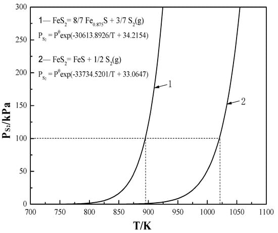 According to the pyrolysis reactions (Equations (1) and (2)), the equilibrium constant (lnKθ) could be obtained, that is, lnKθ = ln{[PS2/Pθ]ν} (ν is the stoichiometric ratio of gaseous S2). After taking lnKθ into the Van’t Hoff equation of ΔrGθ = −RTlnKθ, the relationship between PS2 and temperature was presented as PS2 = Pθ{exp[ΔrGθ/(−νRT)]}.