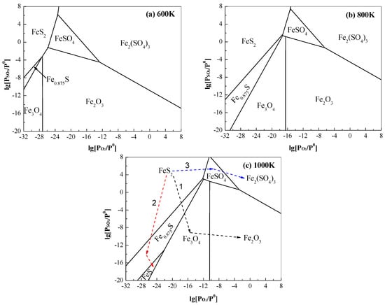 Isothermal predominance area of the Fe–S–O system as a function of lg[PSO2/Pθ] and lg[PO2/Pθ] at a temperature of (a) 600 K, (b) 800 K and (c) 1000 K.
