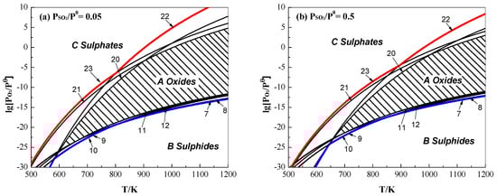As seen in Figure 4, iron oxides are produced from the oxidation of pyrite and its pyrolysis product, that is, pyrrhotite in the areas above Lines 7–12 (i.e., Equations (7)–(12)) and also from the decomposition of iron sulphates in the areas below Lines 20–23 (i.e., Equations (20)–(23)). As a result, an intersected area (i.e., shaded Area A) was obtained that represents the stability area of iron oxides. Similarly, iron sulphides and sulphates are thermodynamically stable in Area B and Area C, respectively. Comparing Figure 4a with Figure 4b, the decrease of PSO2/Pθ enlarges Area A and hence improves the thermodynamical stability of iron oxides, which is consistent with the results in Figure 3. As seen from Area A, an increasing T and O2 partial pressure appears to favour the formation of iron oxides. Thermodynamically, the reaction conditions of O2 partial pressure (or concentration) and T should be controlled within Area A to ensure the roasting of pyrite to iron oxides. In practice, besides minimizing the pressure or concentration of SO2, the temperature should be not too high in order to avoid the occurrence of sintering during roasting.