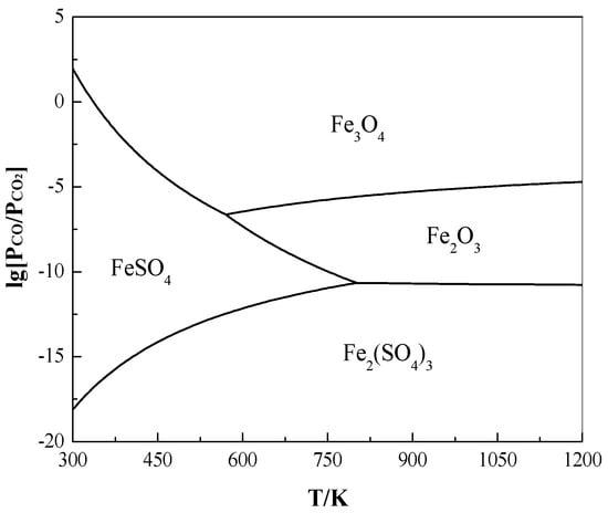 It is clearly shown in Figure 5 that the iron sulphates are readily transformed to the iron oxides due to the reduction of CO at very low levels of PCO/PCO2. When T is lower than ~800 K, FeSO4 easily changes to Fe3O4 or Fe2O3 with an increasing T. The required PCO/PCO2 for this transformation is reduced from 10−6 at 500 K to 10−10.6 at 800 K. In addition, CO is liable to reduce Fe2(SO4)3 to FeSO4 once PCO/PCO2 is higher than 10−18–10−10.6 and then further reduce from FeSO4 to Fe3O4/Fe2O3. As T exceeds ~800 K, Fe2(SO4)3 tends to be more thermodynamically stable than FeSO4, but it is apt to be directly oxidized to Fe2O3 at PCO/PCO2 > ~10−10. Therefore, during the desulphurizing roasting of pyrite to iron oxides, the presence of a certain amount of carbon is likely conducive to prevent the formation of the by-products of iron sulphates, which is preliminarily verified by a recent research on the roasting of a refractory carbonaceous sulphide gold concentrate [].