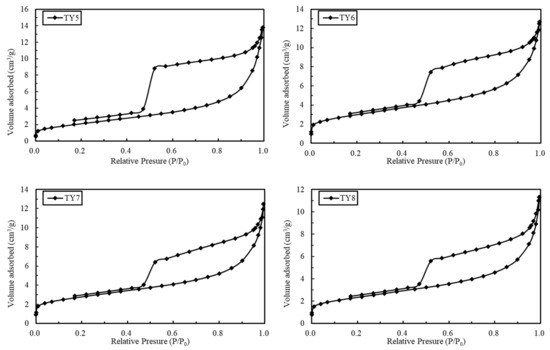 At present, liquid nitrogen adsorption analysis is an effective way to study the nanopore structure characteristics of materials [42,43]. According to the adsorption isotherm types classified by the International Union of Pure and Applied Chemistry [44], all of the shale samples here studied correspond to the Type IV isotherm with a hysteresis loop (Figure 2), which is the result of capillary condensation occurring in the mesopore [41], indicating that a large number of mesopores developed in the shale samples. As a whole, the adsorption curve presented an inverse s-shape. At the low-pressure stage of P/P0 < 0.4, the adsorption curve was nearly horizontal, slightly curving upward and rising very slowly, indicating that this stage corresponded to the transition from adsorption monolayer to multilayer. When 0.4 < P/P0 < 0.8, the adsorption curve began to rise slowly, and this stage corresponded to the multi-layer adsorption stage. In the P/P0 > 0.8 segment, the adsorption curve rose sharply with the increase of pressure, but when the relative pressure was close to the saturated vapor pressure, the gas adsorption did not reach the saturation state, because capillary condensation occurred in the macropores.