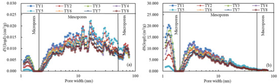 Low-pressure N2 adsorption was performed by the Autosorb iQ Station 1 Specific Surface Area Analyzer produced by Quantachrome Ins. Firstly, we crushed the selected shale samples through a 40–60 mesh. In order to remove the residual gas in the sample, the shale sample needed to be vacuum-degassed at 105 °C Celsius for 10 h. The test tubes containing the samples were placed in a Dewar bottle containing liquid nitrogen and connected to the analysis system. Then, high-purity nitrogen was applied for physical adsorption–desorption determination at a test temperature of −195.8 °C. The surface area of the shale samples was obtained by linear regression with the multi-point BET model, and the pore size distribution and pore volume of the shale samples were calculated by using the capillary condensation model Barrett–Joyner–Halenda (BJH) method [41].