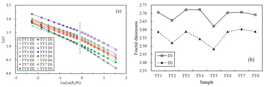 The plots of lnV versus ln(ln(P/P0)) and the results of fractal dimensions estimated according to this fractal model are presented in Figure 4 and Table 4. Figure 4a shows that two linear segments (D1 and D2) with different gradients were obvious, which suggested two obvious phases of the N2 adsorption process, containing monolayer–multilayer adsorption (D2) and pore infilling (D1). The two sections showed a significant linear relationship, with correlation coefficients of more than 0.95, indicating that the marine Taiyuan shales are fractal [47].