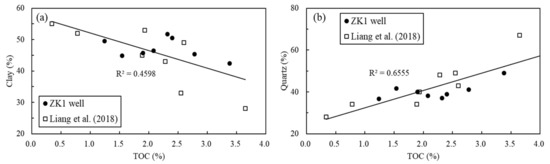 Plots of TOC content versus clay content (a) and quartz content (b) in the Taiyuan marine shale. The data were obtained from the ZK1 well and from Liang et al. (2018) [53].