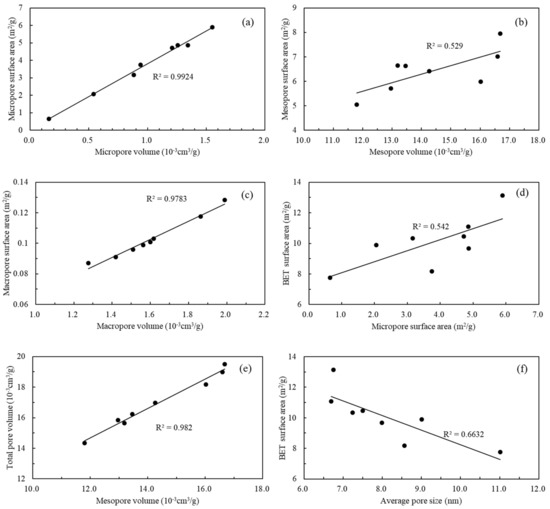 Relationships between SA and PV ((a), micropore; (b), mesopore; (c), macropore), relationship between micropore SA and BET SA (d), relationship between mesopore volume and total pore volume (e), and relationship between APS and SA (f).
