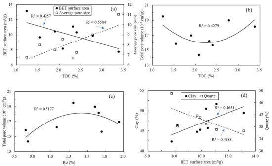 The mineral composition mainly indicates the sedimentary environment of shale in the sedimentary process. The correlations between the abundance of organic matter (TOC content) and quartz and clay content of the Taiyuan marine shale are shown in Figure 5. The results showed that the TOC content was negatively correlated to the clay content (Figure 5a) and positively correlated to the quartz content (Figure 5b), which is consistent with the characteristics of the Wufeng–Longmaxi and Niutitang marine shale in South China and Devonian Horn River shale in Canada [48,49,50,51,52,53]. However, this result differs from the one obtained for the transitional Permian Shanxi and Xiashihezi shales deposited in North China, which show an opposite correlation [31]. The marine Taiyuan shale was deposited in a carbonate tidal flat facies, a favorable environment for the accumulation of organic matter, which is far away from the land and relatively unfavorable to the enrichment of terrigenous clay minerals, whereas the transitional shale was deposited in a shallow water environment, which is conducive to both sedimentation of terrigenous OM from higher plants and enrichment of terrigenous clay minerals. Therefore, different sedimentary environments result in different OM–clay relationships in transitional shale and marine shale. Basins, depressions, and lagoons are favorable areas for the formation of organic-rich marine shale, because their sedimentary systems are relatively stable. In addition, they are unfavorable for the preservation of terrigenous clay, because the terrigenous material has been transported for a long distance. Shale rich in organic matter and clay minerals possibly develops only in swamps or inland lake basins. In marine sedimentary systems, quartz is mainly derived from the hard bodies of siliceous organisms [13,49,52]. Therefore, there is a positive correlation between TOC content and quartz content in marine shales (Figure 5b). Overall, different sedimentary environments control the precipitation of clay and quartz, leading to different correlations between TOC content and mineral content.