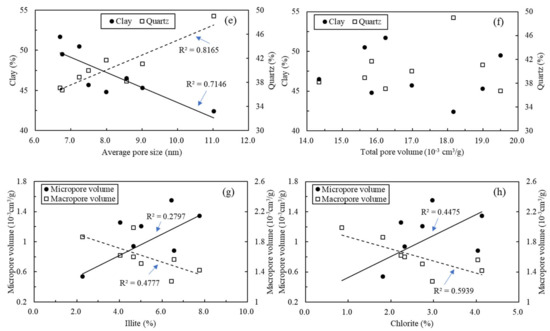 Plots of shale compositions versus nanopore structure parameters in the studied shale. (a) BET SA and APS versus TOC content, (b) PV versus TOC content, (c) PV versus Ro, (d) BET SA versus clay and quartz content, (e) APS versus clay and quartz content, (f) PV versus clay and quartz content, (g) micropore volume and macropore volume versus illite content, (h) micropore volume and macropore volume versus Chlorite content.