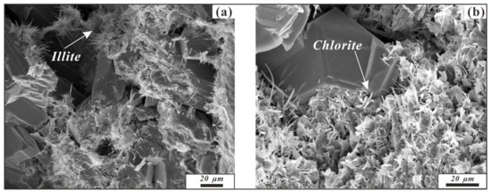 SEM images of illite-associated micro-intergranular pores (a) and slit pores among schistose layers of acicular chlorite (b).
