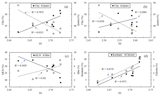 Relationships between shale component and fractal dimensions: (a) clay and quartz contents versus D1, (b) clay and quartz contents versus D2, (c) MLIS and illite contents versus D1, (d) kaolinite and chlorite contents versus D1.
