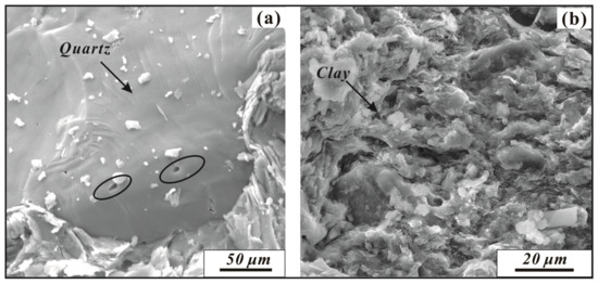 SEM images of quartz and clay minerals in marine Taiyuan shale samples: (a) quartz has fewer pores with a smooth surface, (b) irregular surfaces and a larger number of pores in clay minerals can be observed.