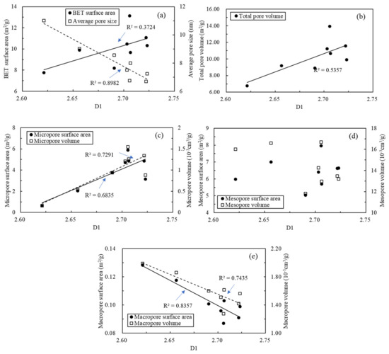 Plots of fractal dimensions versus nanopore structure parameters for the studied shale samples. (a) BET SA and APS versus D1, (b) PV versus D1, (c) micropore surface and volume versus D1, (d) mesopore surface and volume versus D1, (e) macropore surface and volume versus D1.