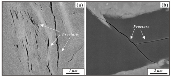 As shown in Figure 11, the fractal dimension correlated positively with the BET SA and total pore volume, with correlation coefficients of 0.3724 and 0.5357, respectively (Figure 11a,b), which indicated that marine shale with higher fractal dimensions may have larger BET SA and higher total pore volume. The fractal dimension showed a negative correlation with the APS (Figure 11a), suggesting that shales with complicated pore structures have relatively small APS. Moreover, the fractal dimension exhibited a positive correlation with the micropore surface area and micropore volume (Figure 11c), suggesting that marine shale with higher fractal dimension tend to possess a greater micropore SA and micropore volume. This finding also indicated an irregular and complicated micropore structure in marine shale, while the fractal dimension had no apparent relationship with the mesopore surface area and mesopore volume (Figure 11c), suggesting that the development of micro-fractures of clay minerals (Figure 12a) and organic matter (Figure 12b) might affect or lead to this relationship. In contrast, Figure 11e exhibits a significant negative relationship between the fractal dimension and macropore SA and macropore volume, suggesting that the increase of macropores led to the decrease of heterogeneity of shale. Therefore, the combination of micro-fractures with different dimensions and nanopores with different shapes and sizes led to a complicated pore–fracture system.