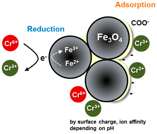 Despite the high Cr(VI) removal efficiency in acidic contaminated solutions, the BMNs were relatively stable at a pH range of 2–10. Therefore, they might be used in most natural and wastewaters. The BMNs that were coated with organic matters were effective in leading the adsorption of Cr(III) with electrostatic interaction, and to prevent fast oxidation of Fe(II) within the magnetite structure enhancing Cr(VI) reduction efficiency in the long-run. These results indicate that the combined effect of the adsorption and redox on the BMNs for Cr(VI) removal are accomplished by two reaction sites of mineral surface and functional organic layers (Figure 6). In addition, the Cr(VI) removal using BMNs may be affected by surface charge and ion affinity depending on the pH. Therefore, BMNs, as functional magnetite-organic complex nanoparticles, may be effective for long-term in-situ remediation for the Cr-contaminated sites with various pH ranges by minimizing the loss of their magnetic recoverability. They also have high potential to applicability for riding heavy metals in environmental remediation technologies.