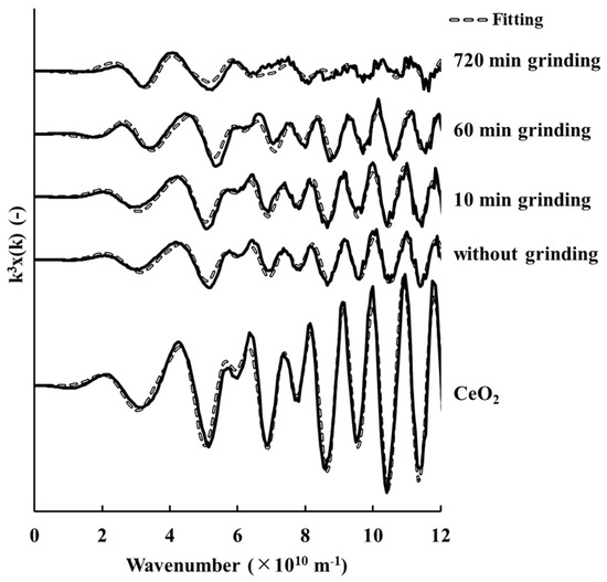 Figure 2 shows that the k3-weighted EXAFS spectra of the sample without grinding was similar to that of the sample ground for 10 min, but these differed from those of samples ground for 60 min and 720 min. This trend is also shown in the RDF (Figure 3). These results clearly showed that the structure of cerianite in the weathered residual rare earth ore started to change after 10 min of grinding.