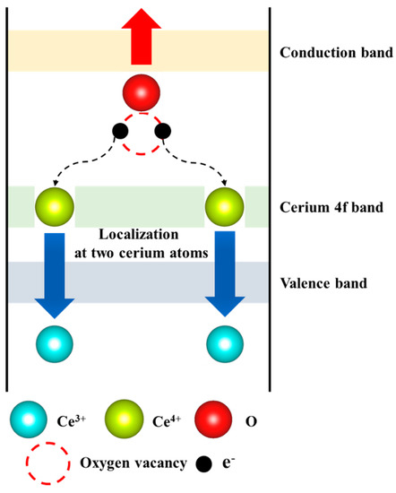 From the results of the XANES and EXAFS analysis, it is suggested that the process of oxygen vacancy formation was closely coupled with the quantum effect of localization–delocalization of the 4f electron of cerium. Oxygen in cerianite has two extra electrons in the p band, provided by tetravalent cerium. When an oxygen vacancy is produced in cerianite, it is suggested that these two electrons are left behind and occupy the lowest possible empty state, which is the f band of cerium. Thus, the tetravalent cerium in the cerianite is reduced to trivalent cerium (Figure 6).