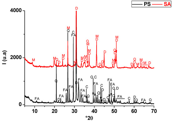 X-ray diffraction patterns of phosphate sludge (PS) and a dolomite-rich clay (SA). FA: fluorapatite (PDF #71-0880); Q: quartz (PDF # 5-0490); D: dolomite (PDF # 83-1766); C: calcite (PDF # 72-1650); M: Muscovite (PDF # 43-0685).
