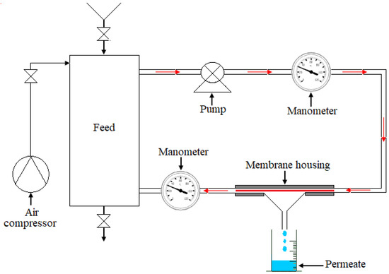 where ΔE: the electric potential between the walls of the membrane and ΔP the applied pressure. The tests were performed at room temperature. The membranes were conditioned by immersion in distilled water for 12 h before the filtration tests. The schematic diagram of the filtration pilot is shown in Figure 2. It was principally composed of a circulation pump, air compressor, feed container of two liters, two manometers, and a membrane model. Transmembrane pressure was variable via a pressure regulator. The filtering surface area was about 24 cm2 for all filtration samples. It is worth noting that three membrane samples were employed for flirtation tests to obtain the reproducibility of experimental results. Moreover, all filtration experimentations were conducted at room temperature.