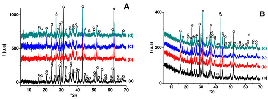 X-ray diffraction patterns of blends heated at 900 °C (A) and 1100 °C (B). (a) SA; (b) SA-SC (5 wt. % of SC); (c) SA-SC (10 wt. % of SC); (d) SA-SC (20 wt. % of SC). G: Gehlenite (PDF # 72-2128); Q: Quartz (PDF # 79-1911); d: diopside (PDF # 75-0945).