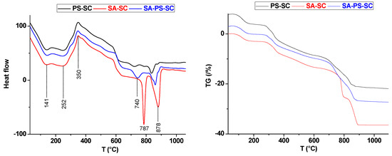 Thermal curves (DTA) and thermogravimetric analysis (TG) of PS-SC, SA-SC and SA-PS-SC.