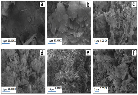 As a result of heating, the laminated structure detected at low temperature (Figure 5a) disappeared, and agglomerated particles took place at high temperature (Figure 5b). The SEM observations (Figure 5c,d) also revealed grainy particles across the matrix, which corresponded to grains of gehlenite according to Energy Dispersive Spectroscopy (EDS) analysis. Loutou et al. (2013) [8] reported that gehlenite formed as granular particles within pores. These pores appeared to correspond to carbonates sites rich with lime (gehlenite formation source). At high temperature (1100 °C), grainy particles of gehlenite were agglomerated (Figure 5e,f) leading to the coalescence of some pores with the increase of temperature.