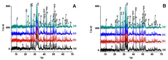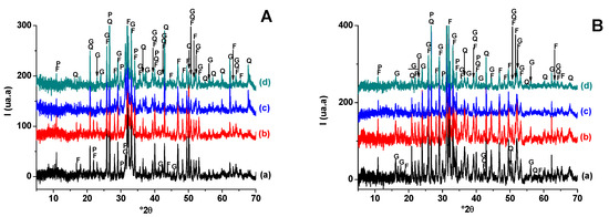 X-ray diffraction patterns of SA-PS (50 wt. % of SA) blends heated at 900 °C (A) and 1100 °C (B). (a) SA-PS; (b) SA-PS-SC (5 wt. % of SC); (c) SA-PS-SC (10 wt. % of SC); (d) SA-PS-SC (20 wt. % of SC). G: Gehlenite (PDF # 72-2128); Q: Quartz (PDF # 79-1911); F: Fluorapatite (PDF # 83-0556); P: Calcium phosphates (PDF # 11-0232).