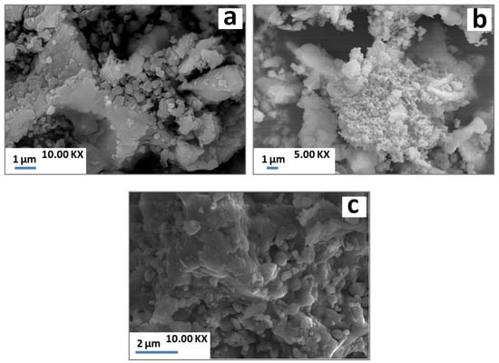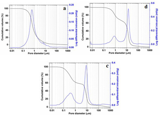 Results of pore-size distribution (mercury-intruded volume versus pore size), for micaceous clay, phosphate sludge, and the ternary mixtures, are shown in Figure 10. It is revealed that both PS-containing samples (PS-SA and PS-SA-SC) displayed both larger pores (12–7 µm diameter) and lower pores (2–0.2 µm diameter) with a narrow range of distribution, and therefore exposed a marked incremental porosity (50% and 38%) for pores with 10 µm diameter respectively (Figure 10b,c). On the other hand, Figure 10a showed that SA-SC samples were the subject of only micropore formations. An incremental porosity of about 23% corresponding to pores of 0.7 µm diameter. The results obtained for both PS-containing blends is very interesting, since it will help inhibit the membrane resistance against mass transfer, and subsequently increase the filtration performance. It is clear that the pore formation process depends closely on the firing temperature [48,49] and elements liable to form pores (organic additives, carbonates, etc.).