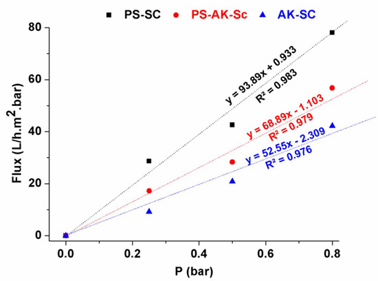 Variations of the flux versus the transmembrane pressure (Figure 11) showed a nearly linear behavior for all the studied samples. Theoretically, the flux is defined by the following equation: