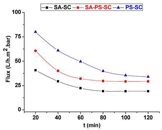 where J is the permeate flux (L/h.m2), Lp water permeability (L/h.m2.bar), and ΔP the applied transmembrane pressure (bar). The value of the water permeability can be deduced from the slope of the line drawn through the experimental points. It is about 93.89, 68.89, and 52.55 L/h.m2.bar for SA-SC, PS-SC, and SA-PS-SC, respectively.