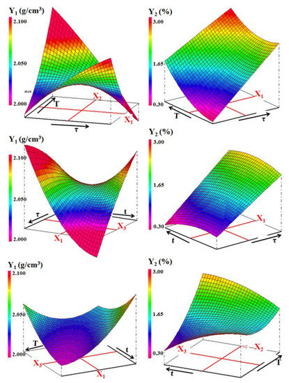 τ0, T0, and t0 are the sawdust addition, firing temperature, and soaking time at the centers of the experimental range (τ0 = 12.5 wt. %, T0 = 1000 °C and t0 = 2.5 h). Δt, ΔT, and Δt are the variation steps of the considered variables (Δt = 7.5 wt. %, ΔT = 100 °C and Δt = 1.5 h). a0 is a constant, and a1, a2, and a3 are the weights of the effects of sawdust addition, temperature, and soaking time, respectively. aij expresses the weight of the interaction effect between i and j factors, and aii is considered to be a curve-shaped parameter. The coefficients were calculated by Nemrod software using the least-squares regression [38,39]. For this purpose, multiple experiments (16) were performed according to the Dohlert matrix. The test at the center was multiplied (repeated 3 times) to estimate the experimental error. The experiments proposed by Doehlert matrix and the experimental values of physical properties are shown in Table 2. The accuracy and validity of the used model was confirmed by the analysis of variance (ANOVA) [40,41,42] represented in Table 3.