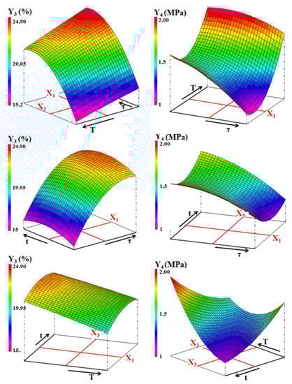 The variations of the technological properties (Yi) of the membranes versus the processing factors (sawdust addition (τ), temperature (T), and soaking time (t)) was assessed using a second-degree polynomial model [16,36,37]. This equation is in the following form: