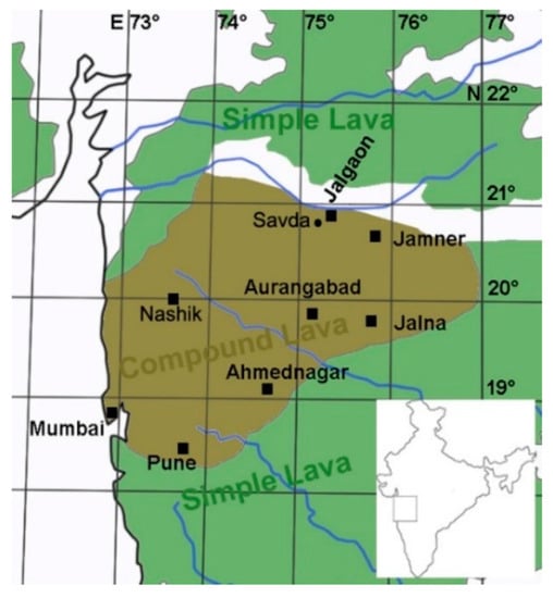 - Beane, J.E.; Turner, C.A.; Hooper, P.R.; Subbarao, K.V.; Walsh, J.N. Stratigraphy, composition and form of the Deccan Basalts, Western Ghats, India. Bull. Volcanol. 1986, 48, 61–83. [Google Scholar] [CrossRef]