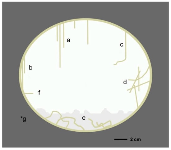 The investigated lava flow in Savda contains different kinds of cavities. Small ones up to approximately 5 cm in size occur in the upper and bottom line of the flow and are usually described as vesicles or as amygdales filled with secondary minerals, but they are not the subject of this paper. In the core line of the flow, the irregularly shaped large cavities are more or less partly filled with secondary minerals, commonly with a free space in the center. They reach up to approximately 50 cm (maximum is approximately 100 cm wide) in size, and are usually not covered by the term vesicle or amygdule. We follow other authors [,] in using the term vesicle for small open cavities, amygdales for small filled cavities, and the term cavity for large filled cavities. The shape of the cavities varies widely, even for neighboring cavities (Figure 3). Rather round cavities are common, and sometimes they are horizontally or vertically elongated. Cavities with a flat bottom and an upward convex, skirted shape occur frequently. Tunnels or breccia were not observed. Big cavities indicate in several cases an interconnection of smaller ones. Photographs of six cavities in Figure 3 represent a variation of shape and fillings.