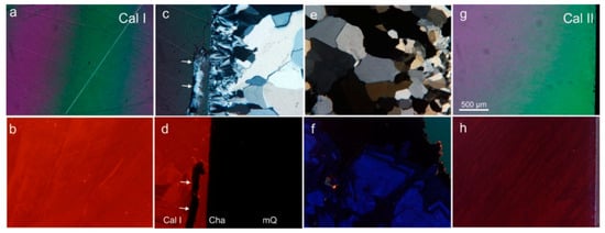 Cathodoluminescence (CL) measurements were performed on carbon-coated, polished thin sections using a “hot cathode” CL microscope HC1-LM (LUMIC, Bochum, Germany). []. The system was operated at 14 kV accelerating voltage and a current of 0.2 mA (current density of about 10 µA/mm2). Luminescence images were captured “on-line” during CL operations using a peltier cooled digital video camera (OLYMPUS DP72, OLYMPUS Deutschland GmbH, Hamburg, Germany). CL spectra in the wavelength range 380 to 1000 nm were recorded with an Acton Research SP-2356 digital triple-grating spectrograph with a Princeton Spec-10 CCD detector (OLYMPUS Deutschland GmbH, Hamburg, Germany) that was attached to the CL microscope by a silica-glass fiber guide. CL spectra were measured under standardized conditions (wavelength calibration by an Hg-halogen lamp, spot width 30 µm, and measuring time 1 s). For characterization of the transient CL behavior of hydrothermal quartz, CL spectra were taken after distinct times of electron irradiation.