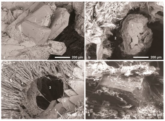 Polarizing microscopy in transmitted light on polished thin sections was performed on a ZEISS Axio Imager A1m microscope (ZEISS, Thornwood, NY, USA). Documentation of microtextures in linear and crossed polarized light was realized using a digital camera Axiocam MRc5 and the software Axiovision (Version 4.6, ZEISS microscopy, Jena, Germany). SEM measurements (SE, BSE) were performed on carbon-coated thin sections and sample pieces using a JEOL JSM-7001F (20 kV, 2.64 nA) (JEOL, Tokyo, Japan) with a BRUKER EDX system. In addition, sample pieces without carbon coating were analyzed using a ZEISS EVO 10 SEM coupled with a BRUKER Quantax EDS system. (Table 4).
