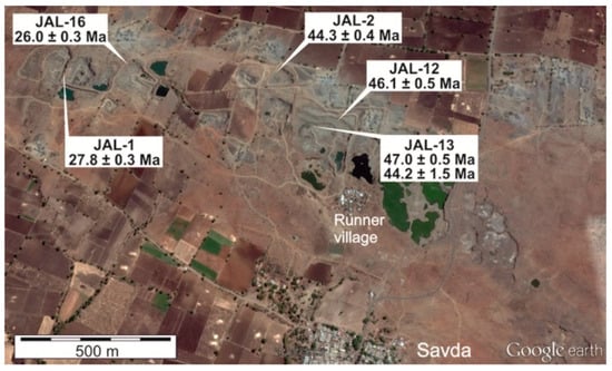 Since 1975, well-developed minerals of DVP were increasingly observed in new occurrences and have updated the knowledge about the distribution of the secondary minerals. Besides the booming trading process, new sites were discovered not only in the western DVP but also in the central area, and their minerals have been reported []. In the present study, the mineralization sequence of secondary minerals in open cavities of a huge quarry complex (20°59′N, 75°27′E, 230 m asl) at Savda village close to the city of Jalgaon (Maharashtra, India) as well as neighboring occurrences in the State of Maharashtra, India, were investigated to reveal the mineralization processes of the secondary minerals in the DVP (Figure 1).