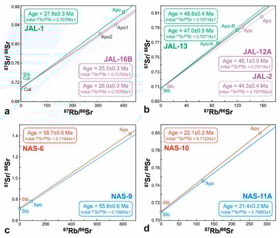 Chemical sample preparations for Rb and Sr isotope analyses were performed at the Geological Survey of Austria in Vienna. Weights of samples used for dissolution were about 200 mg. Apophyllite, stilbite, and celadonite were dissolved in a mixture of HF:HNO3 = 4:1, whereas calcite was dissolved in HCl. Chemical sample preparation followed the procedure described by Sölva et al. []. Isotopic measurements were done at the Department of Lithospheric Research at the University of Vienna. Rb and Sr concentrations were determined by isotope dilution using mixed Rb-Sr spikes. Rb ratios were measured with Finnigan® MAT 262 MC-TIMS, whereas Sr ratios were analyzed with a ThermoFinnigan® Triton MC-TIMS (Thermo Fisher Sientific, Waltham, Massachusetts, USA). Sr was run from Re double filaments, whereas Rb was evaporated from a Ta single filament. Total procedural blanks were <1 ng for Rb and Sr. During periods of measurement, the NBS987 standard yielded 86Sr/87Sr = 0.710248 ± 4 (n = 17) on the Triton TI. Ages were calculated with the software ISOPLOT/Ex [] assuming an error of 1% on the 87Rb/86Sr ratio (Table 8).