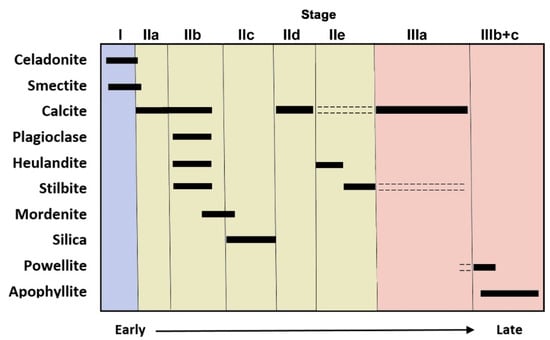 More recent studies concerning the general mineralization sequence at specific outcrops such as in the Mumbai spilite were carried out by Ottens [,]. It was concluded that, in addition to a general sequence of mineralization at different locations in the DVP, several specific sequences exist (Figure 2a–c), which need further detailed investigations to establish a thorough genetic model.