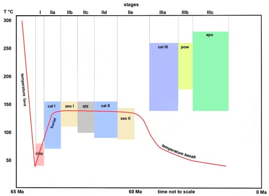 The maximum depth of burial of the basalt in the Savda area is unknown. It is believed that the maximum thickness of the DVP had been approximately 3500 m near Nashik with an escarpment to the western margin []. Based on a rough calculation by a linear decreasing paleo-surface, the total thickness of overlaying basalt and burial at Savda after eruption can be assumed to be 1500 m. The paleo geothermal gradient during the period of eruption of the DVP in the Savda region is unknown. Neuhoff et al. [] estimated for basaltic lavas at Teigarhorn, Eastern Iceland, a paleo geothermal gradient of 53 ± 7 °C/km, Weisenberger and Selbekk [] estimated for Hvalfjördur area, Iceland, a paleo geothermal gradient of 133 ± 10 °C/km, and Jørgensen [] estimated for specific areas of the Faroe Islands a paleo geothermal gradient between 56 ± 7 and 63 ± 8 °C/km. It can be speculated that the geothermal gradient in Savda was between 50 and 130 °C/km. Assuming similar values for a maximum burial of 1500 m at Savda, a temperature of 150 °C can be estimated. It is assumed that the geothermal gradient decreased significantly after the end of the volcanic activity of the DVP.