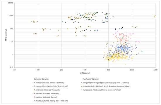 Figure 1 is a binary plot of manganese oxide (MnO) and strontium oxide (SrO). This plot is similar to those previously presented using EDXRF chemical analysis [7,8,9], taking into account that the limit of detection for MnO is higher for EDXRF than for LA-ICP-MS. It was formerly published that the SrO/MnO ratio, measured with EDXRF, is separating freshwater (here presented as filled squares in the figure) from saltwater pearls, as it is >12 for saltwater pearls and <12 for freshwater pearls [8]. Most of saltwater samples can be separated using this ratio as they present higher strontium and lower manganese with a SrO/MnO ratio of >100. However, for the freshwater samples, most present lower strontium and higher manganese samples with a ratio of <1. Chemical analysis of some freshwater samples might lead to wrong conclusions if the previously published plots and ratio are used [8,9], these are the freshwater (natural and cultured) pearls with 55Mn <150 ppmw (i.e., MnO <ca. 194 ppmw) or 88Sr >950ppmw (i.e., SrO >ca. 1124 ppmw). There are two natural freshwater pearls presenting SrO/MnO ratio >12. The SrO/MnO ratio of the studied samples is still not overlapping; all the studied saltwater samples present SrO/MnO ratio >17 and freshwater samples <16.