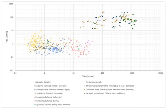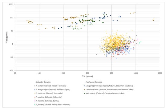 Figure 2 is the binary plot of 55Mn and 137Ba of the studied samples. All freshwater samples present higher 55Mn and 137Ba (shown as coloured filled squares in the plot) than the studied saltwater samples (shown as coloured empty circles in the figure). The population fields of these two group of samples are well apart, and the plot can be used to efficiently separate saltwater and freshwater (natural and cultured) pearls. In Figure 3, freshwater and saltwater samples are well separated. Moreover, freshwater samples present a somehow linear trend for 137Ba vs. 88Sr plots. This is not observed for saltwater samples and it further supports previous studies mentioning that 88Sr incorporation differs in freshwater and saltwater bivalves [27]. This should be further studied on samples from known molluscs and areas like the studied natural pearls founded in Margaritifera margaritifera bivalve from the river Spey (Scotland).