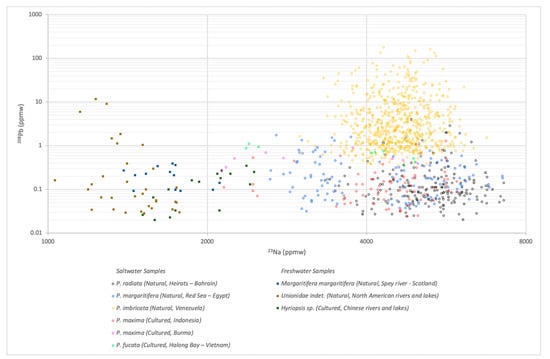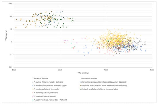 23Na is the most abundant element present in the studied samples in both saltwater and freshwater (Table 3) with higher concentrations for the first than for the latter. Sodium concentration of biogenic carbonate is linked with water salinity and pH [25,36]. All studied samples present diverse concentrations, not linked to specific bivalves or regions. Even the natural saltwater pearls found into the same P. margaritifera bivalve present a great variability of 23Na from 2630 to 7240 ppmw (Table 4) and the natural freshwater pearls from Spey river with 23Na from 1030 to 2450 ppmw. This may indicate that other factors can also influence cultured and natural pearls’ sodium concentration, such as the age of the pearl sac’s epithelial cells where it was found into. In the 23Na and 137Ba diagram presented in Figure 4, saltwater samples are more highly separated than the freshwater samples (filled squares).