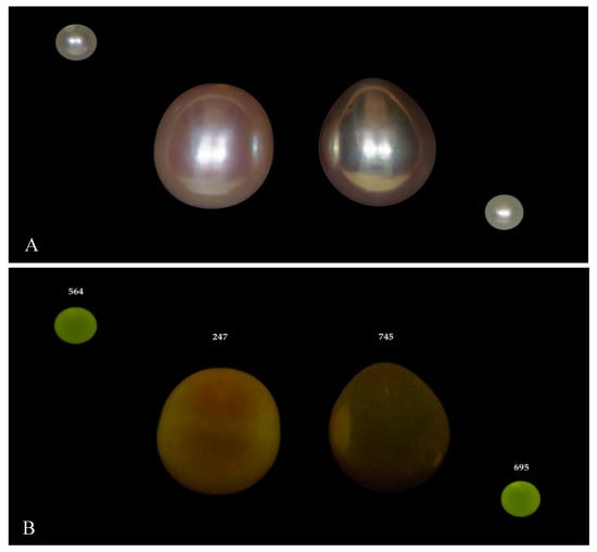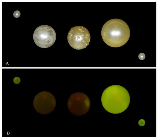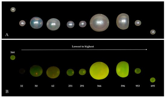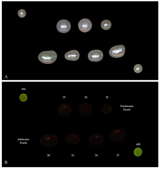 Freshwater cultured and natural pearls contain more manganese (Mn) than their saltwater counterparts. As a consequence, eye visible (nowadays captured with a digital camera in most cases) reactions under X-rays (a.k.a. X-ray luminescence) are different for samples found in different water environments. Freshwater (natural and cultured) pearls luminate a green-yellow colour and saltwater pearls (natural and cultured without bead) remain inert [3,4,5]. However, some cultured saltwater pearls with a bead (made out of freshwater shell) can also give a green–yellow form of luminescence under X-rays. This reaction is due to the manganese content of freshwater bead and the relatively thin nacre (i.e., thickness of nacre material covering the bead) [5]. Cathodoluminescence (CL) microscopy and spectroscopy were also used for pearl characterization, and it was suggested that Mn2+ differs from cultured freshwater to natural freshwater and to natural saltwater pearls [6].