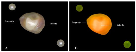 Natural freshwater pearl under daylight (A) and under X-rays (B); orange coloured part is made of vaterite (verified by Raman; see Figure 11). The two freshwater samples upper left (diameter: 2.85 mm) and bottom right (diameter: 2.95 mm) were used as references.